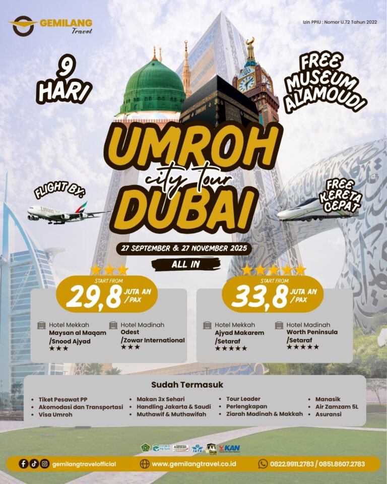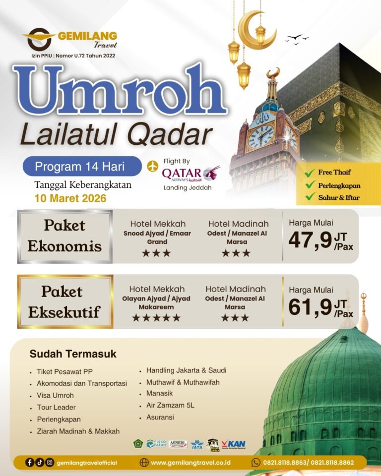 Gemilang Travel telah terdaftar secara resmi di Kemenag RI dengan nomor registrasi PPIU U72 2022.
